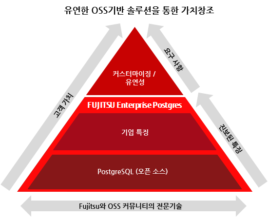 저희 Fujitsu의 데이터베이스 개발 철학은 견고한 오픈 소스 데이터베이스시스템으로서 PostgreSQL을 기반으로 하고 있습니다. 기업용 데이터베이스 플랫폼에 오픈소스 소프트웨어를 적용하는 과제에 대한 해답으로서 Fujitsu는 글로벌 시장에 Fujitsu Enterprise Postgres를 제공하고 있습니다.